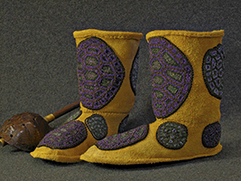 I do so much 'serious' beadwork that it was a pleasure to just engage in a bit of whimsey. My friend Michael is putting together a mini museum and this is my contribution. The boots are about 1-1/4 " tall, about half an inch across the widest part of the sole. My urge towards play suggests that I make a series of these in the style of various groups across the continent, demands on my time say something else... but they are kinda cool eh?