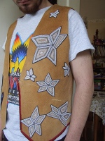 I was asked to create this to replace another piece in an ongoing show on Race (see the exhibits page for information on the itinerary for this show). The show was put together by the Science Museum of Minnesota in St. Paul. I enjoyed working with the curatorial staff on this piece, although I told them from the outset that I might not be the best person to bead something patriotic. Nevertheless, I found a place in myself to work from, mostly centered in the military service of my family, really since there has been a United States. The words on the back are a reworking of a traditional Tsalagi prayer for success in battle. I would like to say here that if any of you get a chance to explore the museum you should. It's wonderful and there are some world class folk working there.