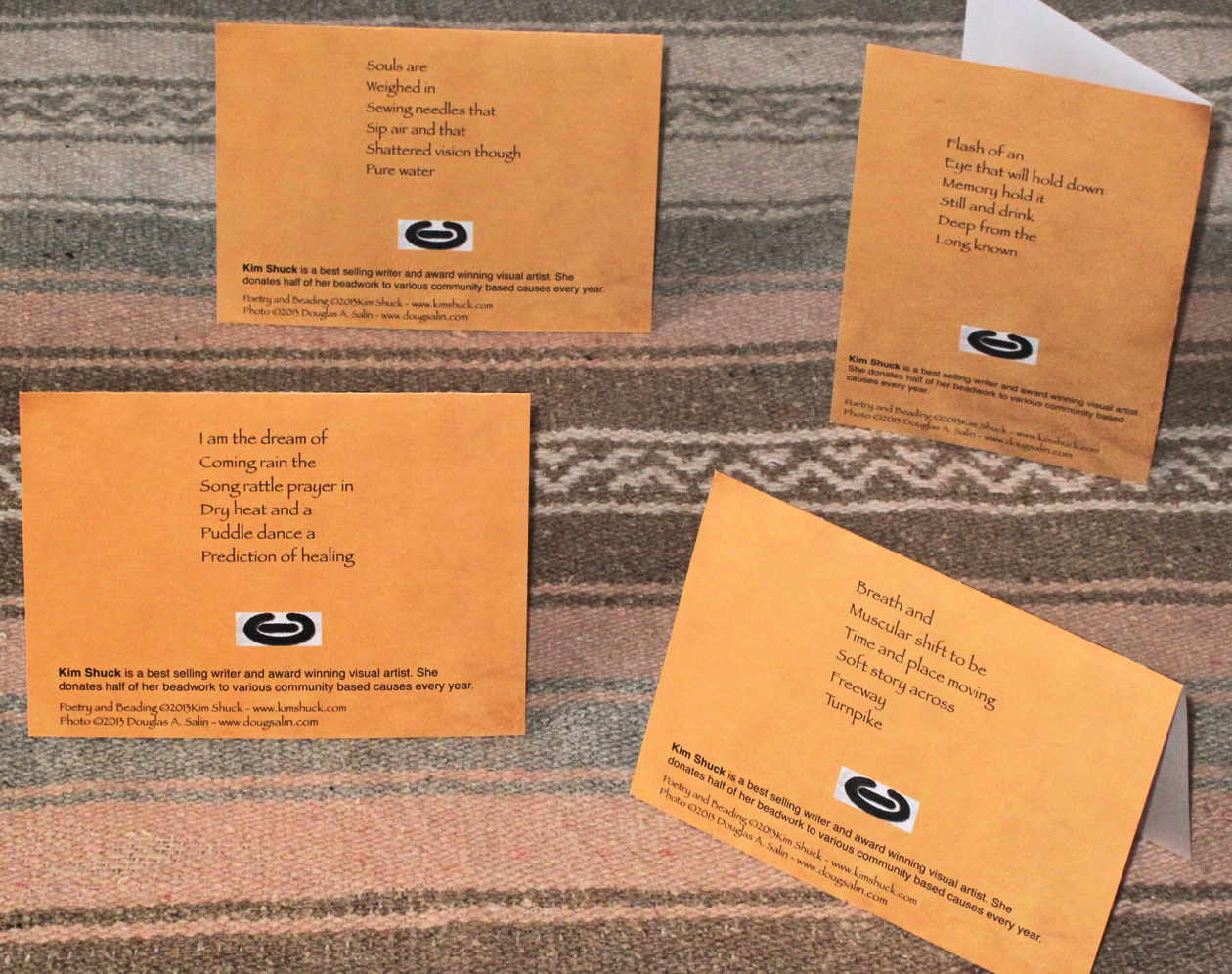 These cards are (very high quality) photographs of four pieces of beadwork by Cherokee artist, Kimberly Shuck. Clicking each of the two photos will allow the viewer will bring up a more detailed copy of the photo. On the reverse, note the poetry. Contact Kimberly for purchase instructions. Thanks for viewing.